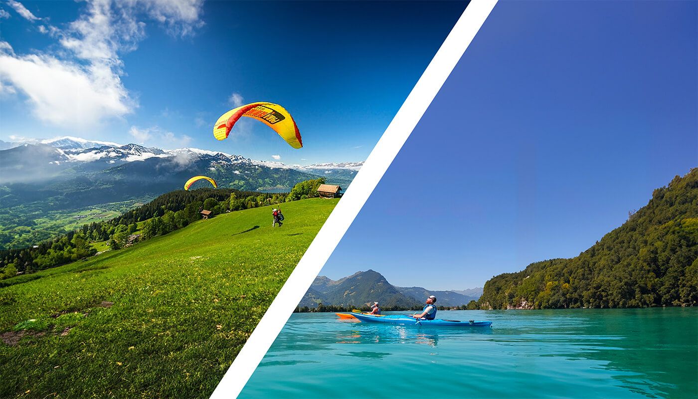 The ultimate Kayaking and Paragliding Package. Experience the thrill of gliding through the skies and the serenity of gliding along the tranquil waters, surrounded by spectacular Swiss scenery.